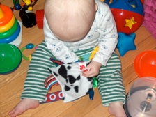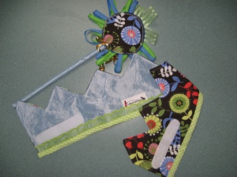 The TAG TOY is made of colourful textured pieces of cloth (fleece one side and cotton, nylon or linen on the other) with a dozen or so tags along the edges. Shapes vary- see images below. Babies are often as interested in the tag on a toy as the toy itself! The tag toy will give your little explorer lots to hang on to or safely gum on. Easily portable- ideal for the diaper bag, car or your pocket for quick entertainment. Some tags are loops, so that the tag toy can be clipped onto something so it cannot be lost. NOTE: Baby should be supervised while paying with this toy. This is NOT a crib toy.
