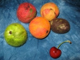 WOOL BALLS AND PLAY FRUIT are hand felted from roving, using both wet felting and dry felting techniques. They are made from 100% wool, with a core of wool or fleece scraps.